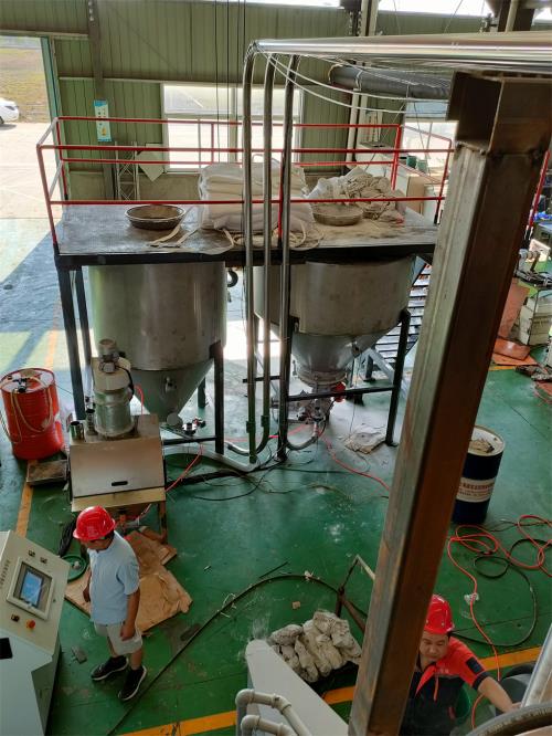 5原料倉2只,用于儲存粉,料倉直徑 1.9米,直端1.22米,錐體1米,圓錐型下口配1.5kw攪拌電機(jī),料倉整體高度2.6米高,容積4.6立方,2mm201材質(zhì)不銹鋼板制作。自動稱重配料系統(tǒng)