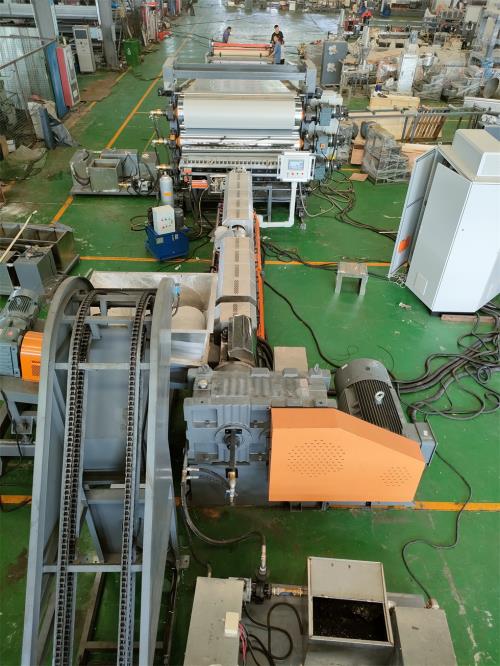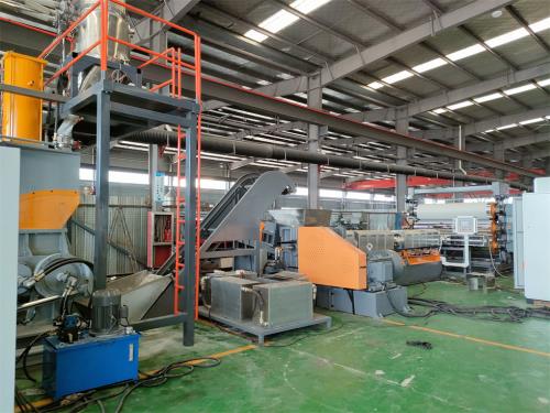 廢木粉填充高密度聚乙烯(HDPE)制備木塑復(fù)合 材料,用茂金屬聚乙烯(mPE SP1520)和POE分別對(duì)復(fù)合材料進(jìn)行改性。在兩者用量小于12時(shí)增韌效果相差不大但用量大于12 時(shí),用POE增韌的復(fù)合材料的沖擊強(qiáng)度和斷裂伸長(zhǎng)率增加 迅速,而用 mPESP1520增加幅度 比較平緩。M.J.O.C.Guimaraes研究了HDPE與POE共混物的力學(xué)性能和熱性能。熱分析結(jié)果表明 HDPE和POE具隔音卷材生產(chǎn)線有良好的相容性,共混材料的拉伸強(qiáng)度和斷裂伸長(zhǎng)率提高,當(dāng)POE含量在10%左右時(shí),材料在室溫下具有較高的強(qiáng)度和沖擊韌性。POE改性聚乙烯(PE)制備的發(fā)泡材料具有良好的彈性和強(qiáng)度,可用于制作粘合膠帶。將30份含離子結(jié)構(gòu)的PE和6.5份偶氮二甲酰胺加入到100份質(zhì)量比為3:7的POE和乙烯一辛烯(含量小于20%)聚合物 Affinity PL1845組成的混合物中,擠成片材后輻射交聯(lián),在250℃下發(fā)泡,隔音卷材生產(chǎn)線所得lmm厚的泡沫片材具有良好的韌性,其橫、縱方向的彎曲強(qiáng)度可分別達(dá)到3O.2MPa和24.3MPa POE未經(jīng)接枝改性 ,樹脂相與無機(jī)粒子形成相互分離的結(jié)構(gòu)。而 POE經(jīng)過馬來酸酐(MAH)接枝改性后與填料粒子的相容性提高,在熔融加工中形成樹脂包覆 無機(jī)粒子的結(jié)構(gòu),能充分發(fā)揮無機(jī)粒子對(duì)樹脂的增強(qiáng)或增韌作用。由于單純對(duì)POE接枝 MAH成本高,而且POE的軟化點(diǎn)低,所以在設(shè)備上隔音卷材生產(chǎn)線必須增加水環(huán)切粒,這樣不僅接枝物的接枝率高,熔體流動(dòng)速率大,而且產(chǎn)品為白色透明顆粒,質(zhì)感好,無異味,改善了單純POE接枝加工上的困難,降低了成本。